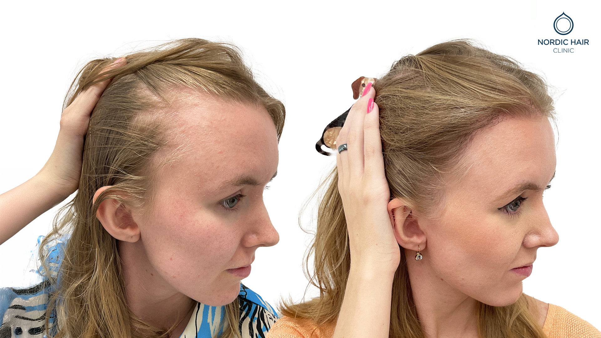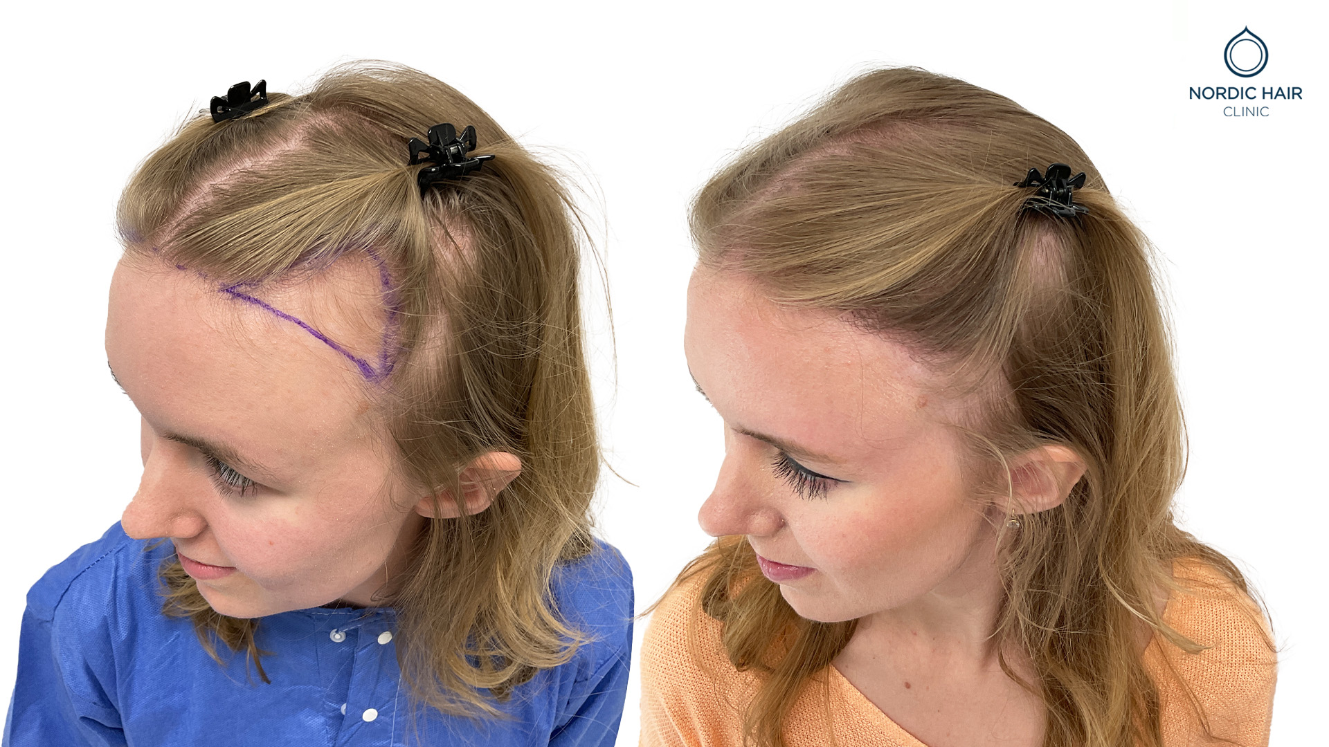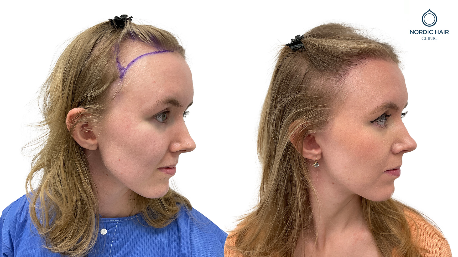 Caroline begyndte at bemærke, at hendes hårgrænse var ved at falde, og hendes tindinger blev højere. Hun henvendte sig til os for at få hjælp til en hårtransplantation og for at få sin naturlige hårgrænse tilbage.