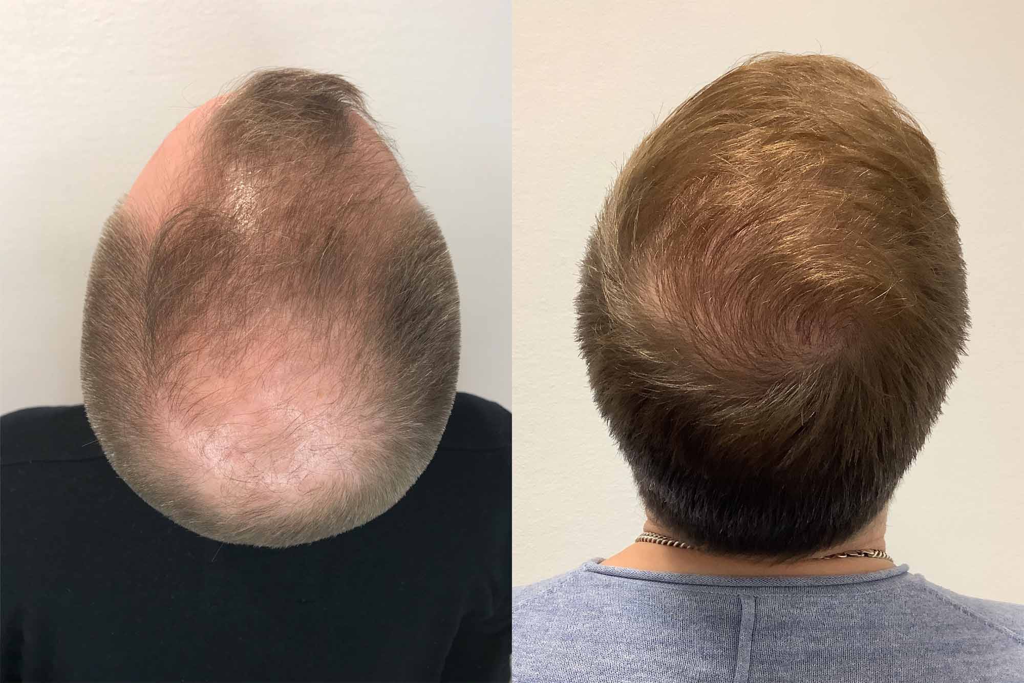 Martins hår ni måneder efter operationen. Billederne til venstre er taget i marts 2020, og billederne til højre er taget i december 2020.