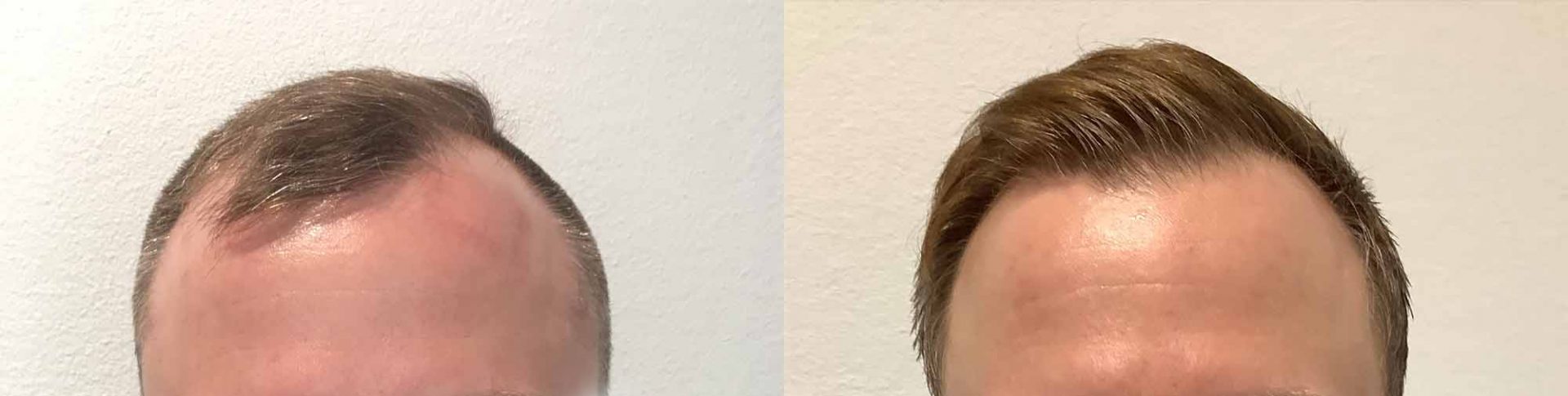 Martin transplanterede 2700 grafts til toppen af hans hoved og tindingerne. Resultatet efter ni måneder er en fyldigere krone og fyldte tindinger.