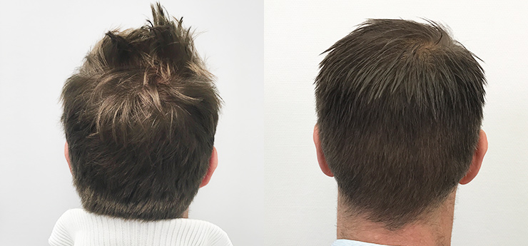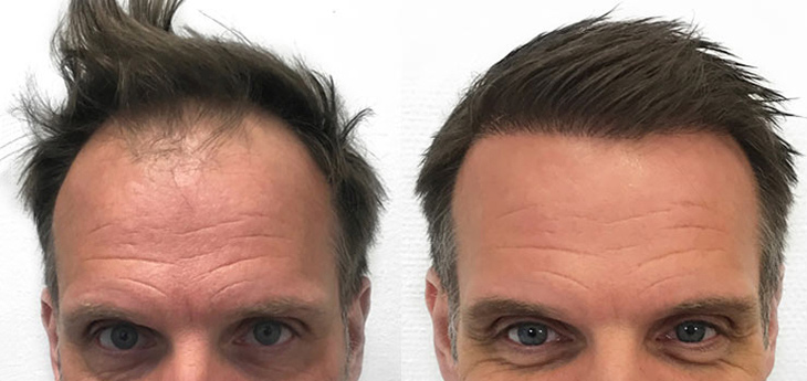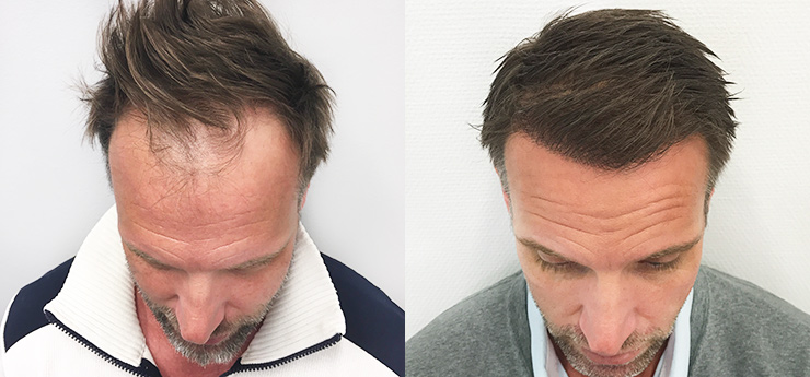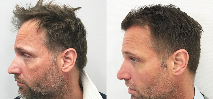 Hos Micke fyldte vi hans høje tindinger med en hårtransplantation. Hans hårgrænse blev mere lige, og håret op til toppen af hovedet blev tættere.