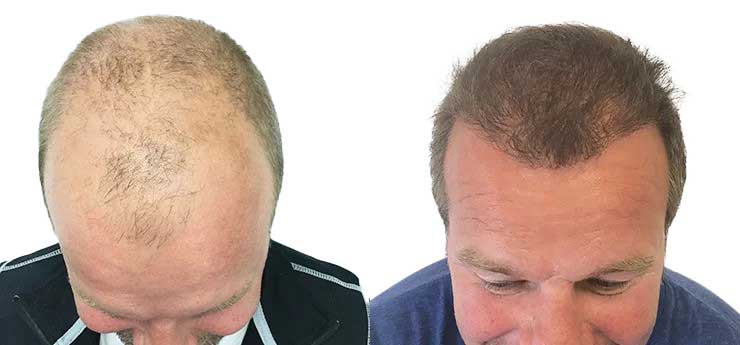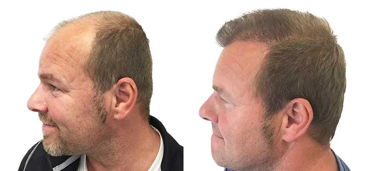 Mickes tynde hår strakte sig op til kronen. Når man har hårtab og tabt så meget hår, er det svært at give et tæt resultat. Så kan man enten vælge at investere i at skabe tæthed på en del af hovedet eller sprede det samme antal grafts ud over hovedet, hvilket giver et sparsommere resultat. På Micke gjorde vi en hårtransplantation på 3 500 grafts.