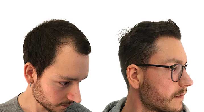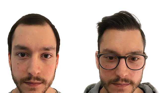Hos Pauli har vi udført en hårtransplantation, hvor vi har fyldt hans høje tindinger ud, sænket hårgrænsen et par millimeter og udjævnet overgangen i hårgrænsen – både foran og i siderne, hvor håret var blive tyndt. Derudover har vi også tilføjet hår til hans krone for at give et tættere og mere ensartet udtryk.