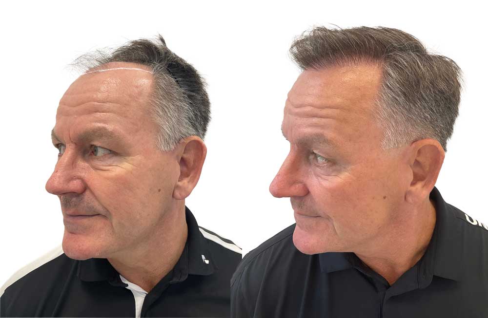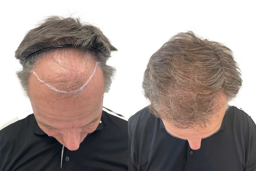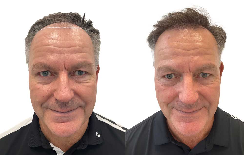 Under proceduren blev 3.000 transplantater transplanteret. Nu, blot 10 måneder efter behandlingen, er resultaterne tydeligt synlige med tættere, mere jævn hårvækst og en frisure, der føles både naturlig og alderstilpasset.