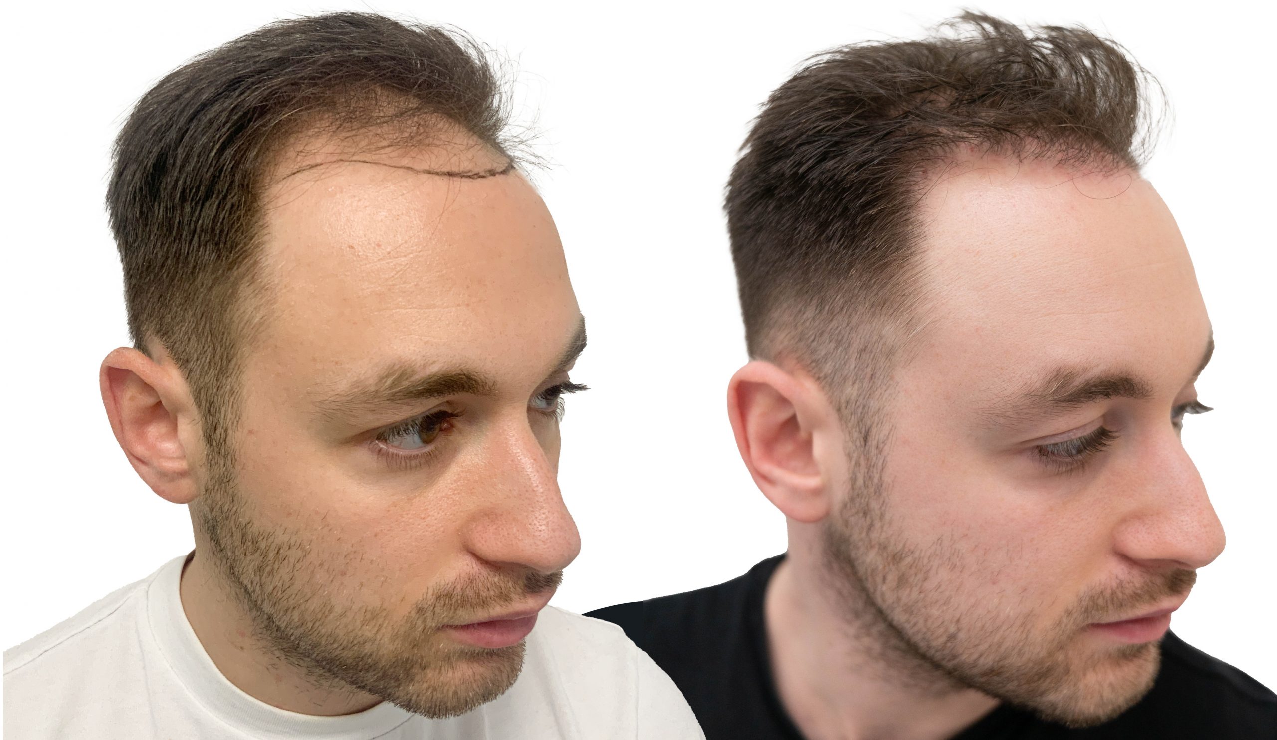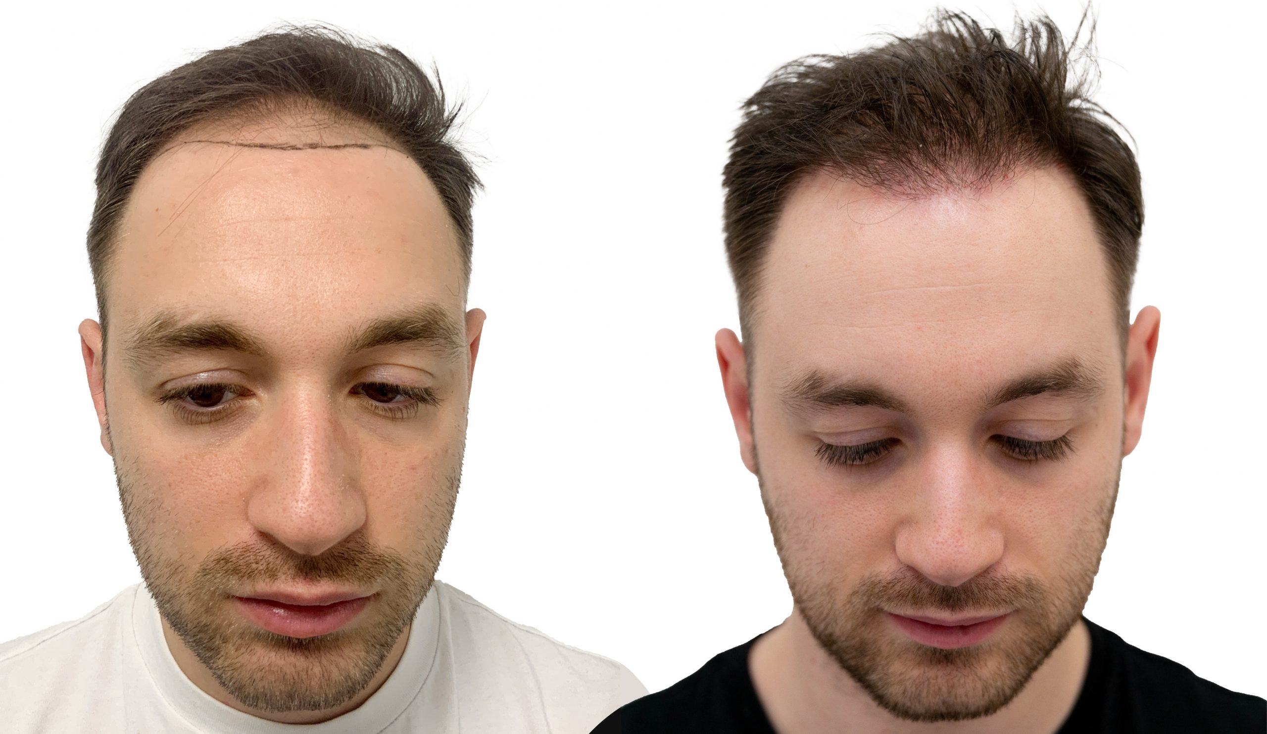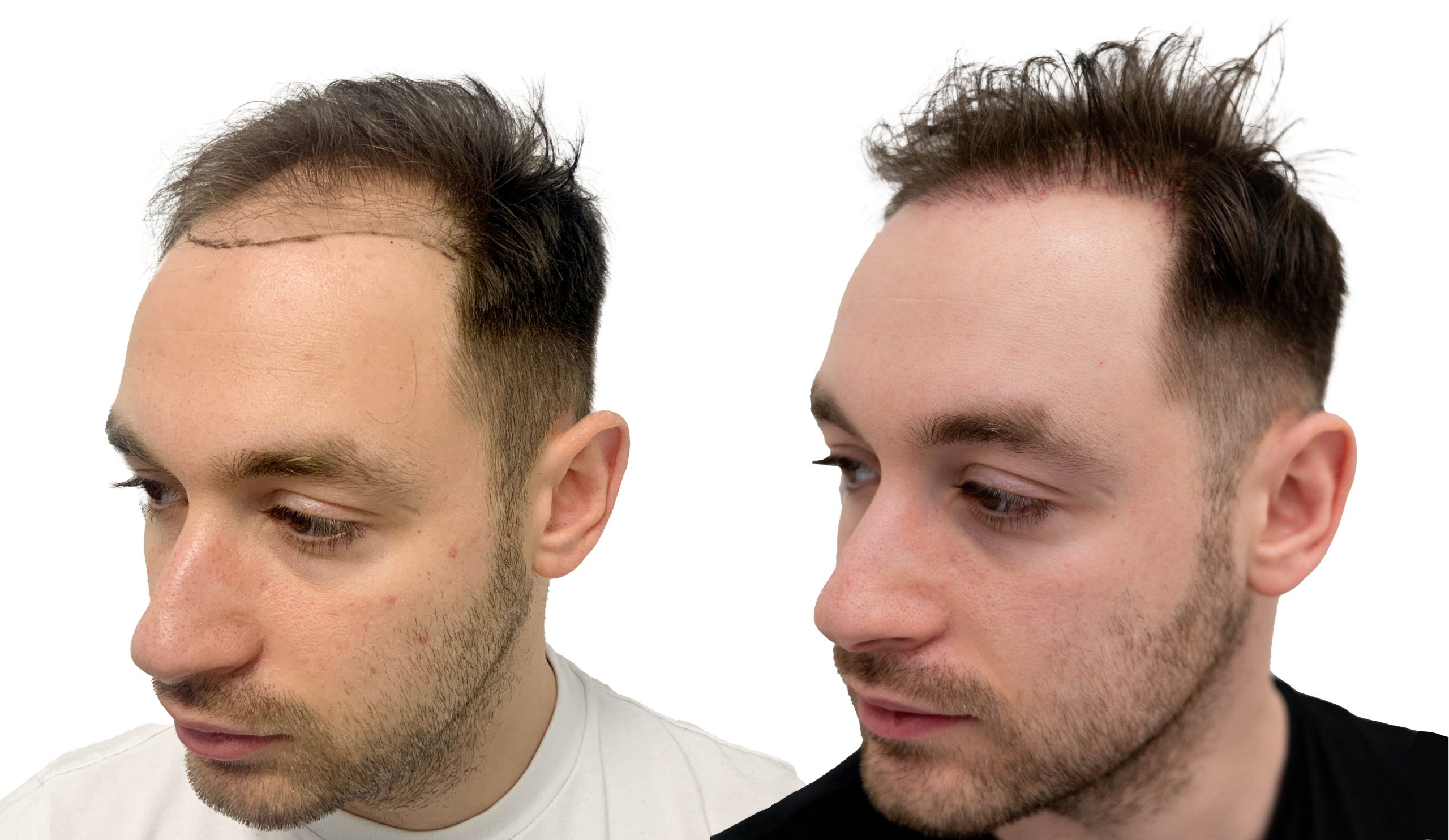 We transplanted 2,500 grafts to fill out Robert’s hairline. 12 months later we can see a noticeable result!