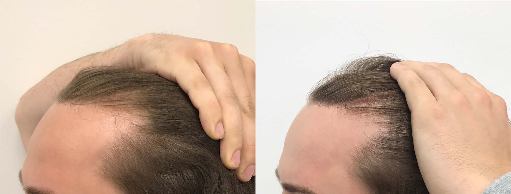 Efter att ha genomgått tre PRP behandlingar under det senaste året ser vi att Franz hår har blivit tjockare och fylligare. Nytt hår har vuxit fram och fyllt ut områdena, vilket skapar en tydlig och fyllig hårlinje.